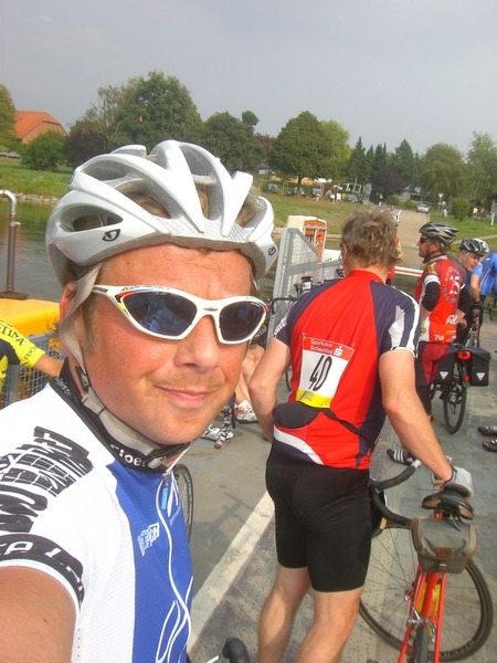 Nach 7 Stunden Fahrzeit und 160km erreichte ich Amelgatzen, die 6. Station. Zwei 100hm-Berge mussten noch erklommen werden, um dann die 7. Labestation, die Weserfähre(nüberfahrt) zu erreichen. In diesen beiden Bergen waren die anderen dann frischer, als ich, so dass ich Glück hatte bis zur Fähre einen Mitfahrer zu erwischen, der auf einen wartete, wenn ich bei 5hm sofort einbrach. Komischerweise waren die Geraden im Gegenwind „locker“ mit 30+ km/h zu treten, aber nie, wenn es bergauf ging.