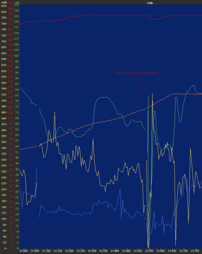 15 Minuten vor dem Ende. Die Leistung ist nicht mehr besonders hoch, aber schön auffällig ist die Heterogenität der Leistungsverteilung. Kurven gibt es hier übrigens kaum welche.