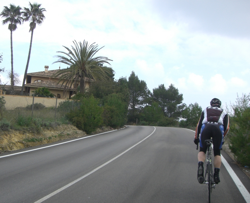 Mir war kalt von der Abfahrt und ich entschied, nicht zu warten und fuhr durch Peguera, um dann wieder nach Sa Capdellá , dem Grußmutterpäßchen, entgegen zu kraxeln. In Calvia hörte ich dann ein „VENGA VENGA“ und ich erwartete die Telekomprofis, die an mir vorbeirauschen…..aber es waren Schum und Sippe, die mich eingeholt haben. 50m weiter habe ich mich dann von den beiden wieder verabschiedet, denn es war 1540 und ich wollte noch in Ruhe duschen und am Pool ein Bierchen zischen mit meinen Jungs. Schum begleitete Sippe noch bis zum Sa Creu hinauf, aber dazu später!