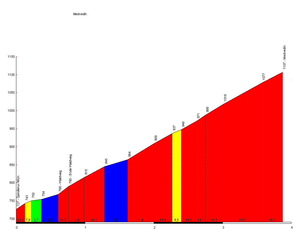 Und es geht! Ich kann dem flotten Tempo relativ leicht folgen, Glücksgefühle wallen vom Bein ins Hirn. Am Fuße des Spinderpasses lasse ich Charlie ziehen, knipse ein bißchen in die Gegend und verhelfe meiner schnöden Käseschnitte zu ihrer Bestimmung. In der roten Ecke: Sieben Kilometer mit knapp 10% im Schnitt. In der blauen Ecke: Peso mit seiner Heldenkurbel von maximal 39x27. :) Ein Fest! Zunächst mäandert sich das Asphaltband bei 5 - 9% aus Przesieka heraus, versteckt uns dann angenehm kühl im Wald und bringt uns, ohne sich auch nur den Umweg einer einzigen Kurve zu leisten, mächtig steil nach oben. Ab der zweiten Schranke beginnt der Spaß. Eine fürchterliche Rampe mit 20% läßt meine Trittfrequenz weit unter 50 sinken, mit Sonnenmilch parfümierter Schweiß beißt in die Augen...weiter geht es bei 15%, dann 12%...und nach 800 Metern ist es geschafft. Mir geht es hervorragend. :) Für 1,5 km buckelt sich die Piste jetzt bei 7,5% im Schnitt angenehm weiter und erlaubt sogar den Einsatz des 24er Ritzels. Ich wußte ja, was noch bevorstehen würde...und tatsächlich sehe ich bald vor mir eine dunkelgraue Mauer, an die sich einige bunt gekleidete Wanderer geheftet hatten. Zunächst verschärft sich der Gradient auf 17,18 %, frisch und übermütig aus dem Flachstück überhole ich die gelben Anoraks, erhole mich kurzzeitig bei 11% und stehe dann dem Levelendgegner gegenüber. Noch einmal 20% über 100 Meter. 6,5 km/h zeigt der Garmin. Das sind 35 U/min. Ich wanke, biege, reiße, Laktat summt im Ohr, der Wahnsinn stiert auf den wie festgeklebten Reifen, das Tretlager knarzt vor Erschöpfung und dann, ja dann, bin ich doch tatsächlich oben. Oh ha! Am Pöhlberg war ich dem Absteigen zwar deutlich näher, aber mit 39 Zähnen vorne ist das ein kolossaler Amstel Gold. 27% (oder gar 30%) sind das aber im Leben nicht.
