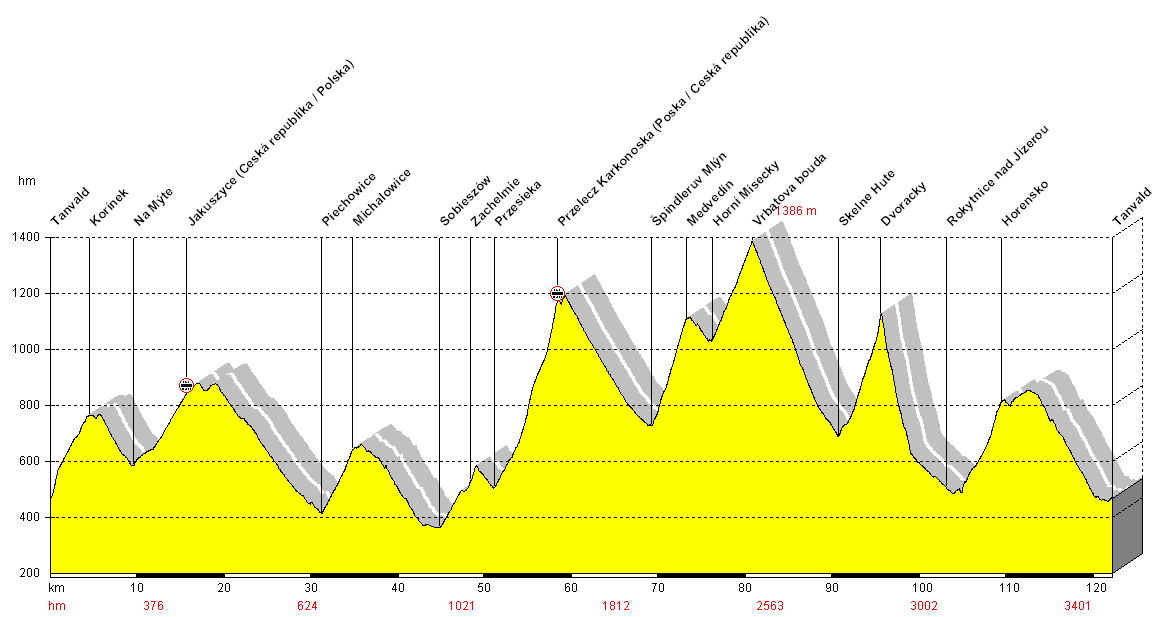 Schlußsteigung. Wieder 19%. Aber schön, der zweite Anstieg heute (neben der Vrbatova bouda), der mir wirklich gefällt und nicht einfach nur schwer ist. In Tanvald plündern wir unter den entsetzten Augen der Angestellten einen Supermarkt, verzichten auf die Fahrt nach Liberec und warten auf den violetten Triebwagen mit dem kauzigen Schnurrbart.