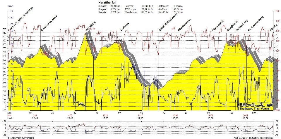 In Oker wurden dann Mittagspause und Entkleiden unisono betrieben: 25 Grad ließen Arm- und Beinlinge verschwinden. Über die Okertalsperre bestieg ich Clausthal-Zellerfeld ( die Strasse bin ich noch nie gefahren ?!?!???) , um dann die dicke Piste hoch auf den Sonnenberg zu Bolzen. Ich war gut drauf und wollte noch ne Zugabe: Abfahrt nach St. Andreasberg und hoch über die B27 zum Ausgangspunkt Braunlage.