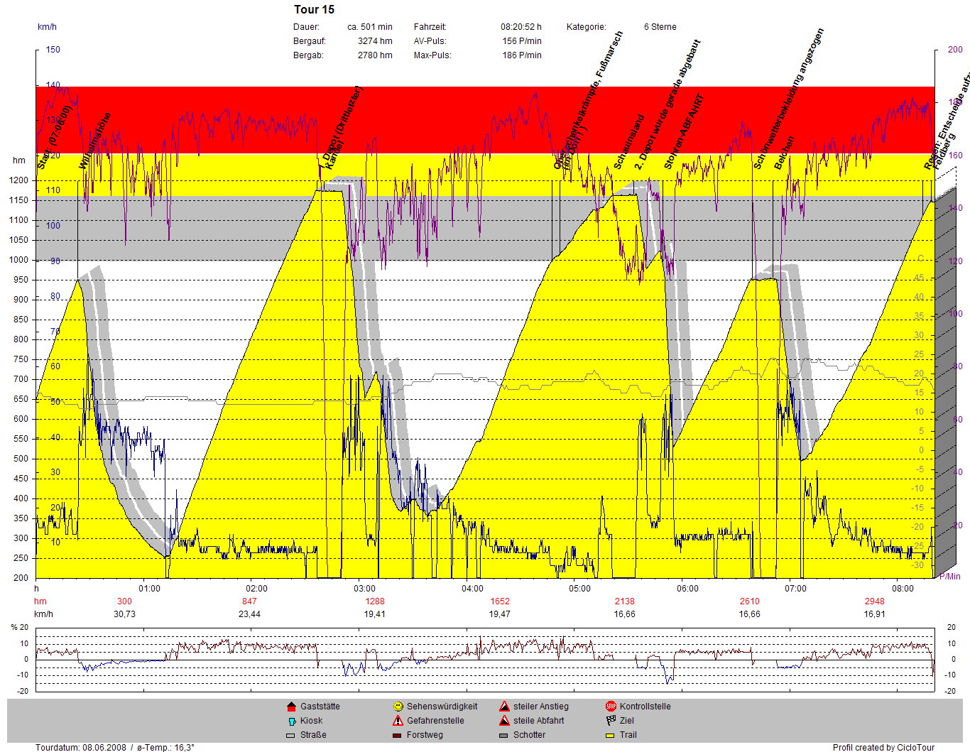 440 Minuten alleine gefahren und dabei 3000hm gefahren. Habe ich noch nie geschafft. ich bin total zufrieden mit meiner Leistung, jedoch sind 20km/h für die gesamte Tour einfach zu schnell.