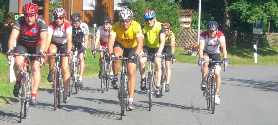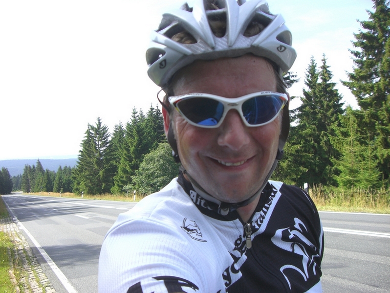 Wir erreichten Hohegeiß, eines der schönsten Dörfer im Hochharz. Ich sinnierte ein wenig dahin, unterhielt mich , so glaube ich mit einem Celler, als es plötzlich laut knallte: W:I:N:N:N:I schallte es durch meinen Kopf. Hat er es geschafft und hat seinen Schlauchreifen durchstochen? Ich rief verzweifelt nach hinten, aber die Antwort blieb aus. Ich ließ mich zurückfallen und dann überholte mich ein Mann laut fluchend mit einem schmatzenden HR. Knapp dahinter radelte lächelnd der Winni und meinte, dass bei ihm alle ok wäre und warum ich das halbe Dorf zusammenschreie. Ich freute mich, dass es ihn nicht erwischt hat.