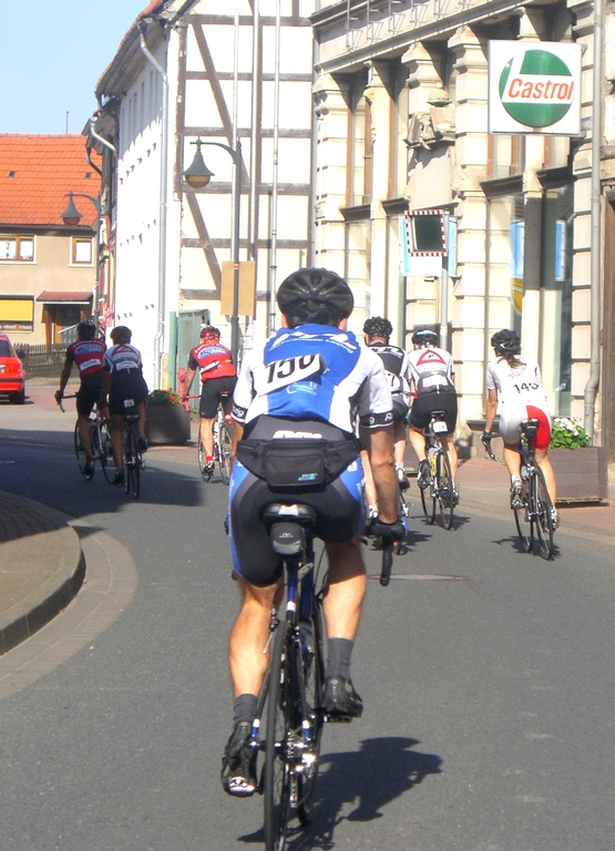 Mit 4 Cellern und Falcon und mir wurde blackdevil bis zur Abbiegung in Herzberg nach Bad Lauterberg für die 120km Fahrer begleitet. 145km hatten wir geschafft, nun kam der weniger spektakuläre Teil: 55km im Flachen, aber zu Beginn gnadenlos dem starken gegenwind ausgeliefert. Zu meiner Beruhigung hat sich mein Oberschenkel wieder frei gestrampelt. Vorne fuhren zwei Celler, die einfach nicht genug haben wollten/ konnten mit bis zu 36km/ gegen den Wind. Als wir dann in den Kantenwind bei Wulften abbogen, gab es aber das erste Opfer und einer unserer Sechser-Gang ließ abreißen. Auch bei rückenwind waren wir nun alle – auch aufgrund der heißen Temperaturen – doch darauf bedacht, zusammen das Ziel zu erreichen.