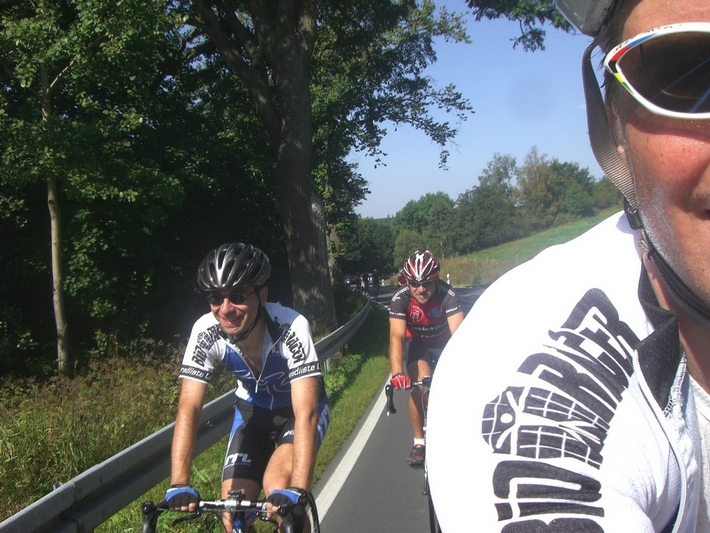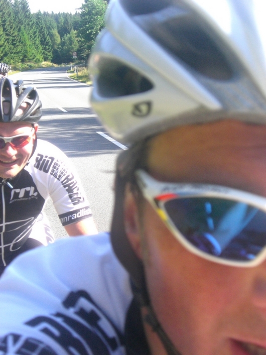 Oben wurden die Bidóns gefüllt, meine waren jedenfalls beide leer. Ich habe insgesamt 12 Flaschen komplett getrunken und 240g KH in Form von Gel während des Marathons zu mir genommen. Oben begann ich Winni zu suchen. Ich erkannte ihn aufgrund des Schweißes im Auge nicht sofort, aber behauptete steif und fest, dass er mich stets gesehen hätte! Ok, man hatte auch Sicht bis 500m voraus, aber dann wäre er noch nicht so schnell oben. Nun kam Winnis Stärke: Die Abfahrt. Winni voraus, ich hinterher und die Celler Männer erfreuten sich der rasanten Fahrt. Es ging spielte sich viel im Wald ab, so dass die Gegenhänge ordentlich gedrückt wurden. Das kostete natürlich wieder Kraft und Falcon hämmerte mit 100er die Berge hoch und nur einer folgte ihm bei drei Stichen. Ab dem vierten war er in der Gruppe unauffindbar. Es war wohl zu schnell für ihn. In dieser Phase merkte ich mal wieder, dass kurze Stiche ein Garaus für mich sind. Auf den Gerade konnte ich gut Druck aufbauen, aber in der Gruppe fährt man halt einfach nicht sein Tempo, sondern versucht am Berg dran zu bleiben. Ein Fehler, der sich später bitter rächen sollte.