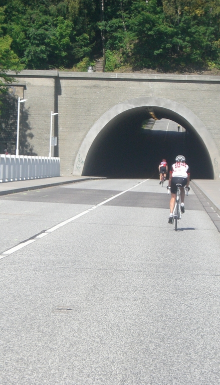 Nur noch 30km bergauf und dann noch 70km bergab bzw. gerade. So redete ich mir den nächsten Streckenabschnitt schön. Unsere Gruppe fuhr los, als ich noch nicht alles beisammen hatte. Falcon grinste und schlug ein eins zu eins vor, da ich nun die Gruppe verpasst hätte. Dafür hat er auf mich geartet und das war überlebenswichtig, dass ich ein VR bekam, das ich anvisieren konnte. Wir fuhren an der Harzer Schmalspurbahn vorbei. Die kannte Falcon noch nicht und ich konnte ein wenig angeben mit meinem Fachwissen. Egal, 2 Fotos geschossen während der Fahrt, Konzentration auf das Wesentliche. Die erste Spitze bei Elend tat schon höllisch weh in den Beinen, dafür war der Asphalt auch noch sehr sehr ruppig auf der Abfahrt. Nach Braunlage schleppte ich mich mit Falcon und 4 anderen Fahrern, darunter Manfred aus Celle, die zwei widerlichen Zinken hoch. Bergab konnte man nach Braunlage nicht toll reinfahren, da uns 10 Cabrios mit Anfang drreißigjährigen Jungs überholten, die sich gegenseitig fotografierten, wie geil sie doch in ihren Kisten sitzen bzw. aussehen. Jedenfalls haben diese Autos die Ampelkreuzung in der Stadtmitte dermaßen zugemacht, dass ich hinter der Eissporthalle einfach abgebogen bin. Falcon folgte mir, aber die anderen trauten sich meiner Ortskenntnisse nicht anzuschließen. Ok, ich konnte auch nicht ahnen, dass hinter der Eishalle die Strasse gesperrt war. Aber als Kenner der Stadt wusste ich noch einen Geheimweg (Fußgängerbrücke), die uns wieder auf die Strasse nach Oderbrück brachte.
