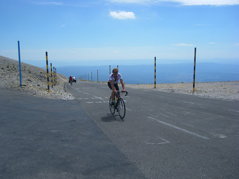 Da unsere Unterkunft zwei Fahrtstunden von Bédoin entfernt war, wurde der Startpunkt erst in glühender Mittagshitze erreicht. Meine Holde bestand dann auch noch auf einem Dorfbummel zu zweit, während das Quecksilber weitere Skalenanteile emporschwoll. Ganze Dutzendschaften von bereits zurückgekehrten Sportskameraden warfen aus den Straßencafés heraus nur mitleidige Blicke auf meine Fahrtvorbereitungen. Bei 32°C im Schatten sollte es also losgehen und ich malte mir bereits mein Dahinsterben an der 1600 Hm-Rampe an der sonnenexponierten Südseite des Kalkriesen aus. Für die gerade mal 23 km lange Tour wurden die beiden großen Wasserflaschen bis an den Kragen gefüllt und ich kündige meiner Begleiterin an, dass ich nun wohl gute zwei Stunden Schinderei vor mir habe, bevor sie mich am Gipfel von Sonne und Wind rosiniert wieder rehydrieren und ins Auto einpacken könne. Nach den ersten, noch recht flachen Kilometern in lockerem Kullertritt war ich bald warmgerollt und der scharfe Steigungsknick an der Kehre Seint Estève nach gut 5 Kilometern gab das Signal zum Einlegen des Rettungsrings. Mit den 39:27 ging es aber nun immer flüssig-fein weiter und bald keimte eine wachsende Lust am Emporfahren in die kühleren Regionen auf. Wegen meines späten Starts war hier unten kaum noch ein Radler unterwegs, irgendwann aber kamen die ersten weiteren Verspäteten ins Blickfeld. Nach und nach fühlte ich mich immer besser, und so wurde noch so mancher Kollege "eingesammelt". Das Châlet Reynard war nach exakt 1 h erreicht, nun sollten also noch 6 km mit knapp 500 Hm folgen, bei denen der (für den Ventoux an diesem Tag leichte) Westwind zwar bremste, gleichzeitig aber auch kühlte. Jetzt machte das druckvolle Fahren immer mehr Spass. Huldigungen an das erste Dopingopfer englischer Provenienz wurden ebenso ausgelassen, wie der Zwischenstopp am Col des Tempêtes kurz unterm Gipfel. Die Beine wollten einfach nur sportlich die restlichen Meter emporzwirbeln, wo ich dann nach 1:25 h und einem Schlußspurt über die keck-steile Abschlußkehre auf dem Gipfelplateau notgedrungen aufhören musste. Die Trinkflaschen waren kaum angerührt und das "Monster Ventoux" war erstaunlich leicht erschlagen. Der mitloggende Garmin wies für den steilen Teil ab Kilometer 5 bis zum Gipfel eine Steigleistung von knapp 1200 Hm/h aus, worüber ich als Bergmops durchaus erfreut war.