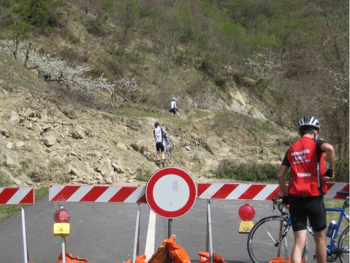 So wie diese Tour läuft es eigentlich dann jeden Tag: Anfahrt flach zum einrollen, Berg(e) erklimmen, Abfahrt genießen und flach wieder zurück ins Hotel ausrollen. Eigentlich vom Profil her optimal. Heute gibt es als Anfang nur den Gorollo. Ruhig anfangen, nicht schon am ersten Tag überziehen! Unterwegs scheint halb Italien auf dem Rennrad unterwegs zu sein. Es sind unglaubliche Massen, die sich auf den Landstraßen entlang wälzen. Die scheinen das Rennen zu fahren, von dem uns erzählt wurde, aber die Straßen sind nicht abgesperrt... Na ja, ist vielleicht nur ´ne Art RTF. Nach den ersten klitzekleinen Höhenmetern steht unsere kleine Gruppe praktisch vor dem Nichts: Die Straße ist einfach mal auf ca. 100 Meter weg. Erdrutsch. Wir schicken einen unerschrockenen Scout auf die ebenfalls mit Kratern geschmückte Wiese, der uns den Weg weist und dann geht`s mit den Rädern über den Acker. Der Rest des Hügels ist eigentlich harmlos und einfach zu befahren, aber nach der Winterpause doch schon beschwerlich für mich. Oben ein Erinnerungsfoto und ab geht’s wieder nach unten. Im Flachen manchen wir noch die 100 km voll und das war’s schon für heute.