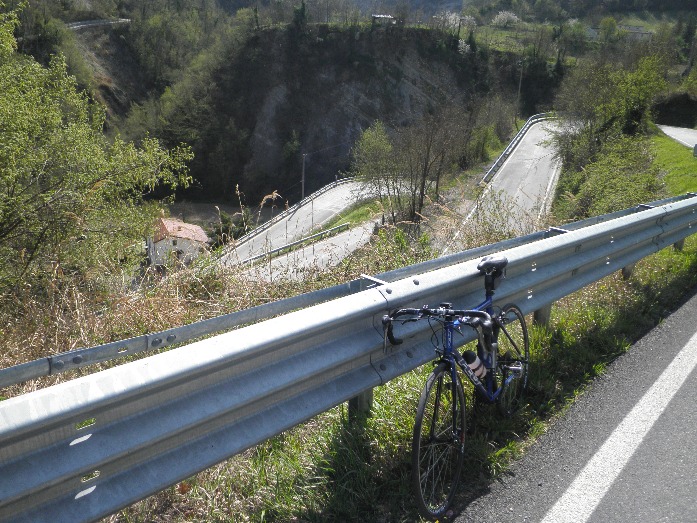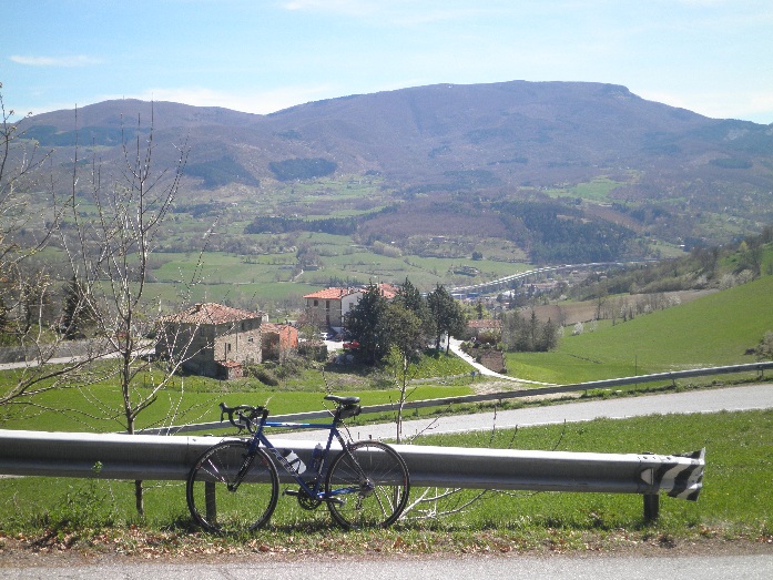 Der Hügel Finoccio wird uns heute als landschaftlich besonders schön beschrieben und so machen wir uns auf den Weg. In Cesena, der nächsten größeren Stadt, weist uns ein netter älterer Herr den Weg, nachdem wir hilflos am Straßenrand anhalten mussten. Er ist auch auf dem Rad unterwegs, alledings auf einem alten Modell aber immerhin mit Kettenschaltung. Sein Englisch ist auch ganz passabel. Ich glaube, er wäre am liebsten mit uns mitgekommen... Im Tale stehen nach einer langen flachen Anfahrt ein paar kurze, harte Rampen auf uns, die unser Grüppchen schon sprengen. Aber oben wird natürlich immer gewartet. Dann geht`s den ersten Hügel hoch. Und schon wieder müssen wir die Räder tragen. Diesmal hat der Erdrutsch nicht die Asphaltdecke weggerissen, sondern die Straße mit Erde überhäuft. Darauf haben sich schon Löwenzahn und Gänseblümchen angesiedelt und es sieht nicht so aus, als ob die Itlaiener Eile hätten, die Straße wieder befahrbar machen zu wollen. Egal, dafür gehört der Hügel uns denn es sind keine Autos unterwegs! Der Anstieg hält sich in Grenzen und es geht so leidlich vorwärts. Oben gibt’s wieder einen schönen Ausblick. Nach der Abfahrt entscheiden sich eine Mitfahrerin und ich, dass wir noch einen Hügel dranhängen. Der ist etwas länger und hat einige Rampen, an denen ich meinen Puls dann doch nicht mehr unter Kontrolle halten kann. Egal, dafür gibt’s kurz nach dem Gipfel DIE Szene-Bar für Radfahrer. Auf dem Gipfel des Barbotto machen wir Cappucino-Pause und schauen ehrfürchtig auf Zeitungsausschnitte mit Coppi und all den anderen, die hier schon mal vorbeigefahren sind. Der Rest des Tages ist ein kleines Auf- und Ab, Abfahrt und dann Ausrollen bis ins Hotel.