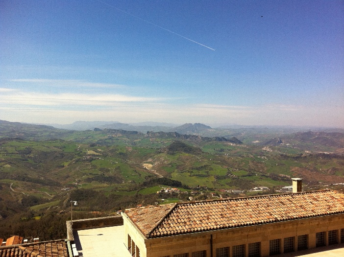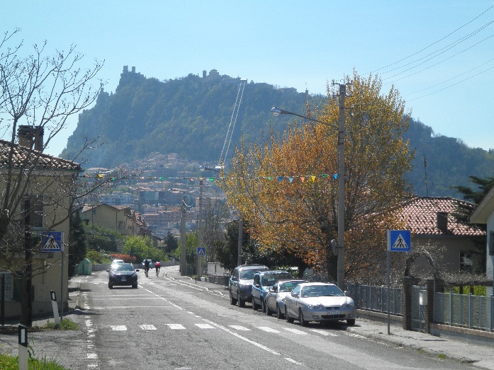 Mann muss sich langsam steigern! Wir sind in einer Gruppe mit ca. 20 Leuten unterwegs, die schon zu groß ist und die es schon am ersten Hügel nach Verrucchiuo ordentlich zerlegt. Im malerischen Verrucchio mache ich ein paar Fotos und warte auf die Nachzügler. Dann kommt ein Übergangsstück mit einigem Auf und Ab zum eigentlichen Höhepunkt: San Marino. Die Marinesen (oder wie sie auch immer heißen wollen) haben sich schon vor Jahrhunderten auf einem sehr markanten, weit sichtbaren Hügel eingeigelt, den es zu bezwingen gilt. Die Steigung ist eher gleichmäßig und nicht zu steil, aber relativ lang. Nach zahlreichen Serpentinen sind wir an einer Art Aussichtsterasse mit grandiosem Blick ins Landesinnere und einigen Caffees angekommen. Der Cappucino ist hier doppelt so teuer wie im Umland. Die Touristenmassen versauen die Preise! Aber vorher machen wir noch ein paar Höhenmeter mehr in die Altstadt. Wie uns aber ein Carabinieri lautstark auf Italiensich zu verstehen gibt, ist Fahrradfahren in der Altstadt aber nicht erlaubt. Na gut, ich muss die 18 oder 20%ige Steigung nicht unbedingt mehr haben, aber mein Mitfahrer kämpft sich, kaum das der Carabinieri wieder außer Sicht ist, im Wiegetritt durch die Gassen nach oben. Noch ein schönerer Platz mit noch atemberaubender Fernsicht ist der Lohn. In diesem seltsamen Land werden übrigens auch allerlei Waffen zum Kauf angeboten, nur deren Ausfuhr / Einfuhr ist wohl verboten...