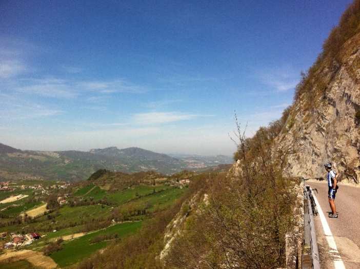 Heute soll die 1000-Meter Marke fallen! Wir ziehen als kleine Truppe von nur vier Leuten los. Die anderen fahren auf für uns ausgetreteten Pfaden lang und wir wollen mal was anderes sehen. Schon nach den ersten flachen 20 km wird deutlich, dass wir uns auf drei Leute verkleinern müssen. Der vierte Mann hat einen schlechten Tag erwischt. Egal, wir restlichen drei sind motiviert! Der erste Anstieg des Tages wird uns mehr oder weniger direkt auf den Pass von über 1000 Meter bringen. Die Sonne knallt schon wieder ganz schön von oben und so steuern wir bald eine Wasserstelle an einer winzigen Kapelle am Wegesrande an: Kopf drunter halten, tut das gut! Nächster Stopp ist Fototermin mit der Burg San Leo im Hintergrund. Weiter geht es kilometerlang bergauf und irgenwann sind wir endlich oben: Serra S. Marco (1006 m). Ein weiter Blick in das bergige Landesinnere öffnet sich. Man glaubt, bis Rom schauen zu können. Nach der Abfahrt überfallen wir eine Tankstelle und erbeuten Speis und Trank. Nach einer Hucke fahren wir durch Carpegna. Von hier soll eine sagenhafte Militärstraße auf den Gipfel des gleichnamigen Berges auf über 1400 Meter führen. Gar gruselige Geschichten wurden uns von anderen Truppenteilen über diesen Anstieg erzählt: Man habe vergessen, Serpentinen in die Straße zu hauen und diese deswegen mit durchschnittlichen 15% geradewegs bergauf geführt. Außerdem soll die Straße ungeräumt sein und allerlei Unrat wie Blattwerk, Kiefernzapfen und Schnee soll noch herumliegen. Wir gedenken einen kurzen Augenblick lang der radsportlichen Opfer dieses Anstieges und fahren locker unseren zweiten Pass des Tage entgegen: Passo Cantoniera (1007 m). In der obligatorischen Bar am Gipfel nehmen wir festes und flüssiges Zuckerwerk zu uns und erfahren, dass der Giro, wie auf so vielen Hügeln der Umgebung, auch mal hier vorbeikam. Die anschließende Abfahrt ist eine der schönsten, die man in dieser Gegend machen kann. Das Foto spricht für sich. Die Rückfahrt wird etwas flott gestaltet, da ein Mitfahrere seinen Massagetermin im Hotel einhalten möchte. Soweit ich noch treten kann, helfe ich ihm, aber ich habe an den Bergen bereits zu viel Energie gelassen, so dass wir ihn (ohne Karte und nur mit einer groben Wegbeschreibung ausgestattet) ziehen lassen. Er erreicht aber zum Glück mühelos und rechtzeitig unser Hotel.