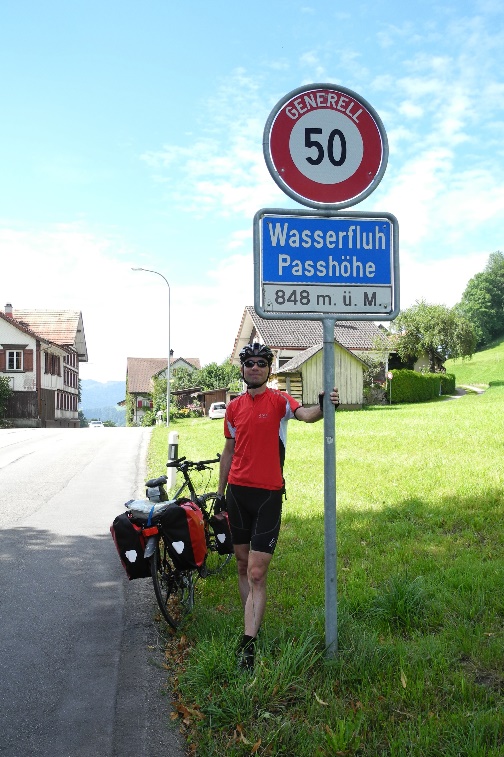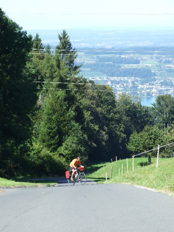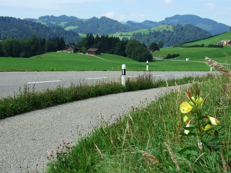 Schon der Einstieg in Pfäffikon muss im zweistelligen Prozentbereich absolviert werden. Im Mittelstück wartet dann ein richtiger Hammer: die Steigung muss irgendwo über 18% liegen, in der Straßenkarte war nur „>20%“ eingezeichnet. An dieser Stelle war ich jedenfalls heilfroh, zu Hause noch einen neuen Ritzelblock mit 28 Zähnen montiert zu haben, der mir in Verbindung mit der Dreifach-Kurbel sogar eine leichte Untersetzung ermöglichte. Und so konnte ich mich so richtig schön hochquälen. Nach diesem Hammer kommt man auf einer Weide mit milder Steigung und mit herrlichem Blick über den Züricher See an, wo wir nach Luft japsen und uns den Schweiß aus dem Gesicht wischen. Aber noch sind wir nicht oben: Die Straße verschwindet gnädigerweise im schattigen Wald und ein Stück weiter zieht das letzte Stück wieder heftig an. Hier oben findet man eine Kapelle und hat einen herrlichen Blick Richtung Alpen-Haupt-Kamm. Wir hügeln uns erst mal auf etwa gleicher Höhe weiter und kommen an der (vermutlichen) Geburtsstätte des Paracelsus vorbei (für mich eine Überraschung und für jeden Naturwissenschaftler ein Höhepunkt!). Etwas später tut sich ein weiter Blick über den Sihlsee auf. In Biberbrugg fahren wir auf die Hauptstraße Richtung Schwyz, die durch den Verkehr leidlich befahrbar ist. Ab Rothenturm geht es bis zum Vierwaldstätter See fast nur bergab und so stören die KfZ nicht sonderlich. In Brunnen am Viewaldstätter See genießen wir am Seeufer, umrahmt von Bergen, die Atmosphäre: Strahlend blauer Himmel, über den See fährt ein Schaufelrad-Dampfer, am Ufer gegenüber soll der Rütli-Schwur geleistet worden sein – Schweizerischer geht es nicht mehr!
