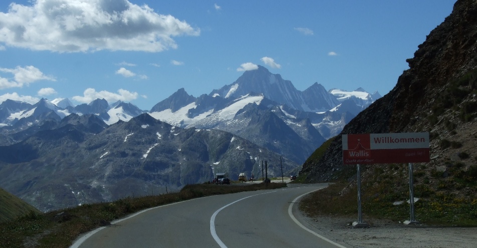 Wir erreichen kurz darauf ein Plateau, lassen Andermatt links liegen und biegen in Hospental rechts gen Realp ab. Hier im Furka-Reuss-Tal können wir unsere Beine ausschütteln und auf die eigentliche Herausforderung des Tages vorbereiten. Von weitem sieht man schon die herrlichen Serpentinen im unteren Drittel des Furka-Passes (http://www.quaeldich.de/paesse/furkapass/). Am Ortsausgang Realp gönnen wir uns noch eine ausgiebige Rast auf der grünen Wiese, bevor wir bei herrlichstem Wetter in den Pass einfahren. Das untere Drittel glänzt mit den schon beschriebenen Serpentinen, die einen tollen Blick zurück durch das Furka-Reuss Tal gen Andermatt und in dessen Hintergrund den Oberalp-Pass bieten. An dem Hotel Galenstock entwirrt sich die Straße, die dann in einem großen Bogen mehr oder weniger gerade entlang eines Hanges nicht steil, aber beständig weiter nach oben führt. Da auch noch die Sonne direkt auf die Straße knallt, ist es ordentlich warm und wir lassen das kühle Schmelzwasser, dass hier in zahlreichen Bächen oder Rinnsalen vorhanden ist, über die erhitzten Köpfe und in unsere Trinkflaschen fließen. Im letzten Teilstück sind noch ein paar Kurven zu bewältigen, ehe wir oben sind. Ein hartes Stück Arbeit ist geschafft! Den Blick zurück kennen wir schon und der Blick nach vorn ist einfach atemberaubend! Ein Panorama von etlichen schneebedeckten 4000-er Gipfeln steht vor uns und davor sieht man die Serpentinen des Grimsel-Passes aus dem Rhone-Tal aufsteigen. Wir legen uns ermattet auf die Wiese und genießen den Ausblick, aber nicht allzu lange, denn hier oben hat man das Gefühl, von der Sonne über kurz oder lang geröstet zu werden. Locker fahren wir in die Abfahrt bis zum Hotel Bellevue, legen eine Pause ein und sehen und die Reste des Rhone-Gletschers an, der sich immer weiter zurückzieht. Immerhin tost hier noch genügend Schmelzwasser ins Tal. Weiter geht es erst den Furka hinab, dann am Abzweig zum Grimsel-Pass vorbei und immer weiter im Rhone-Tal entlang. In Brig suchen wir eine Unterkunft und werden schnell fündig.