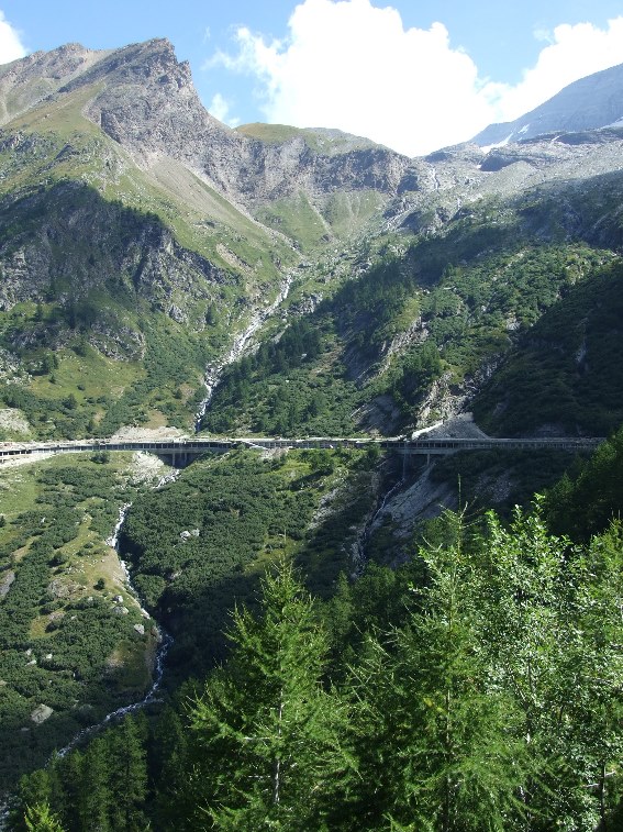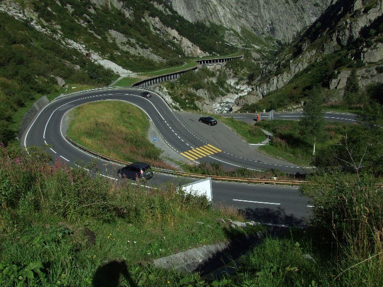Wir müssen uns heute auch nach oben winden und fangen in der Schöllenenschlucht (http://www.quaeldich.de/paesse/schoellenenschlucht/) an. Hinter Göschenen steigt es erst richtig an. Es kommen ein paar hübsche Windungen, zwei Galerien und zum Schluss fährt man an einer etwas spektakulären Stelle durch einen kurzen Tunnel durch eine Felswand und danach gleich über die Teufelsbrücke. Parallel dazu verläuft wieder die Eisenbahntrasse.