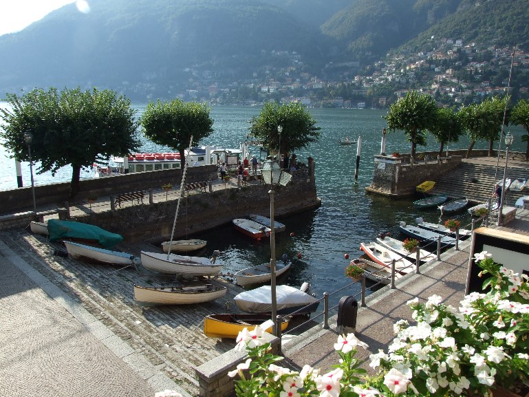 Erst als wir uns die Straße nach Como herunterfallen lassen, gibt es wieder herrliche Landschaft zu sehen: der Comer See inmitten steiler Berge. Wir durchlaufen das hübsche Zentrum der Kleinstadt und finden das Tourismus-Büro. Dort wird uns erzählt, dass aufgrund eines Kongresses alle Hotelzimmer in der näheren Umgebung ausgebucht sind, besonders am linken See-Ufer. Na toll! Also fahren wir am rechten See-Ufer weiter auf der Suche nach einer Unterkunft. Auf den ersten Kilometern finden wir nichts, entweder öffnet uns keiner oder es ist voll. Erst in Torno werden wir fündig. Aber dann bekommen wir gleich etwas ganz tolles! Ein kleines Hotel direkt am See, davor liegt ein winziger Hafen mit Anlegestelle für den öffentlichen Fähr-Verkehr, daneben die Kirche,. Dahinter geht es so steil innerhalb der Ortschaft den Berg hoch, dass Treppenstufen in der Straße angelegt sind und damit den Autoverkehr auf ein Minimum reduzieren – nur Einheimische wagen sich, hier zu fahren. Außerdem wird hausgemachte Küche incl. Eis präsentiert. Wir beziehen ein riesengroßes Zimmer und hier können wir unseren Ruhetag verbringen!