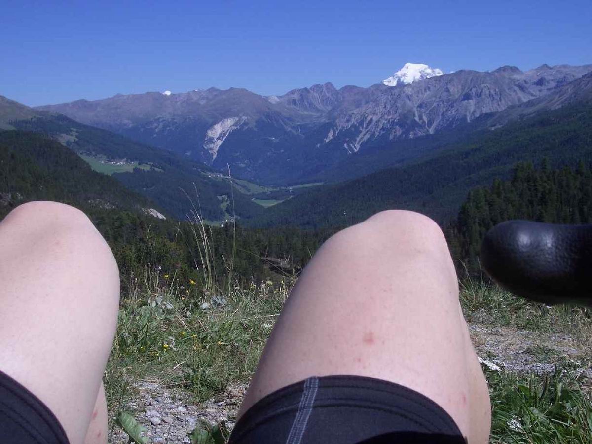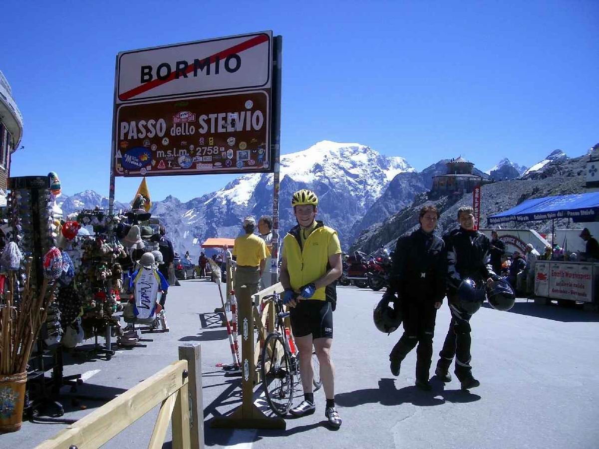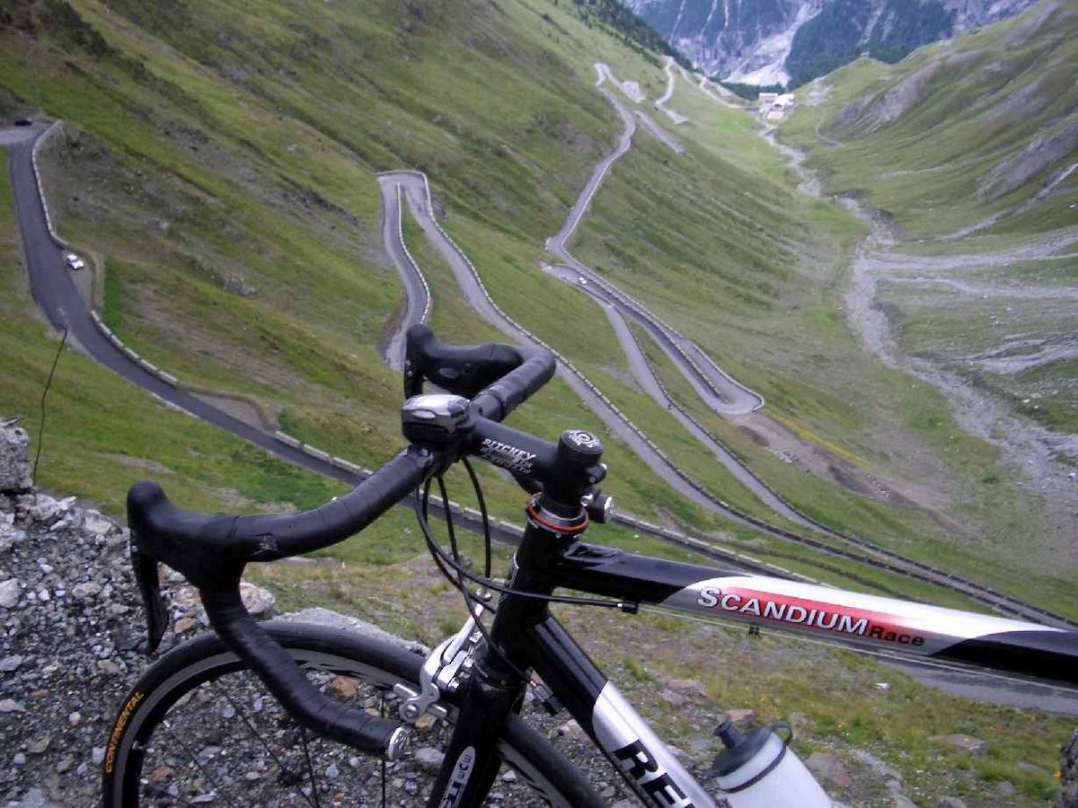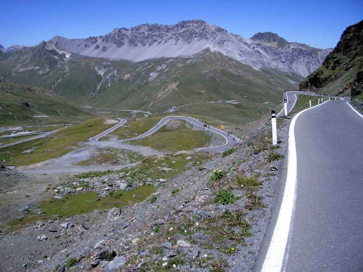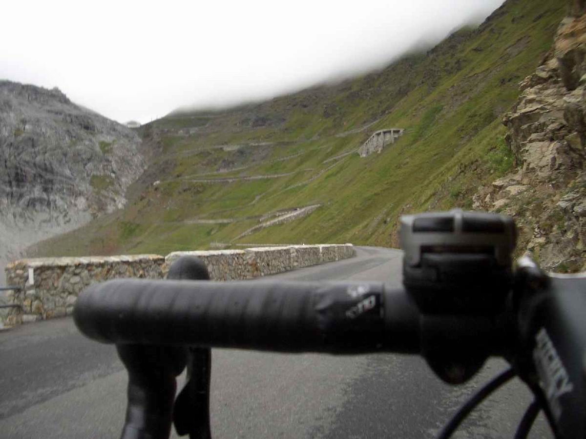 2. Tag: St. Nicolo - Gavia-Pass (2618) - Ponte di Legno - Gavia-Pass - St. Nicolo Der Gavia ist sehr zu empfehlen: wild und relativ wenig befahren. In beiden Rampen Steigungsmaxima von 16%, wobei auf der Südseite mal ein längeres derartiges Stück zu bewältigen ist. Psychologisch delikat, wenn man es unmittelbar vorher runtergefahren ist und genau weiß, was einen noch erwartet. Das gilt auch für den Tunnel. 200 unbeleuchtete Meter. Bergab konnte ich einen Motorradfahrer bitten, mit Licht und Warnblinker auszuhelfen. Auf dem Rückweg bin ich dann nur mit der Blinkfunzel am Helm durchgefahren. Unglaublich, wie dunkel ein Tunnel wird, wenn keine Reflektoren an den Wänden mehr Orientierung bieten. Volle Konzentration auf das Licht am Ende weil man schnell zu eiern anfängt, wenn man bei ca. 8-9% Steigung mit der Tachobeleuchtung rumspielt und die Fahrbahn unter sich nicht mehr sieht; 87km, 2666hm