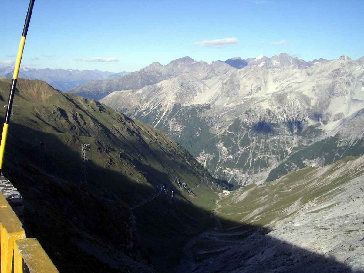 Sozusagen die Königsetappe. Als Einstimmung zunsächst die leichtere Seite des Stilfser Jochs, bei der man an der Abzweigung zur Umbrail-Passhöhe vorbeikommt. Sehr motivierend war es, mit ansteigender Form lockerer den Berg hochzukommen. 9 Radler überholt. Wieder hinunter zur Schweizer Grenze und zum Umbrail, den höchsten Pass der Schweiz, den man vom Stilfser Joch aus ohne zusätzliche Höhenmeter erreicht. 4-5 km der schönen kehrenreichen Abfahrt auf nicht asphaltiertem aber rennradtauglichem "Naturbelag"! Temperatur in Sta. Maria: 34 Grad. Die Anfahrt zum Ofen-Pass ist relativ unspektakulär. Der Weg zurück nach Sta. Maria ist wegen der wenigen Kehren ziemlich schnell. Da können Abfahrtsfreaks so richtig die Sau rauslassen; zurück über die 34 Kehren des Umbrail, nochmal die letzten neun Kehren zum Stilfser Joch hoch und zurück nach Bormio; 111km, 3746hm