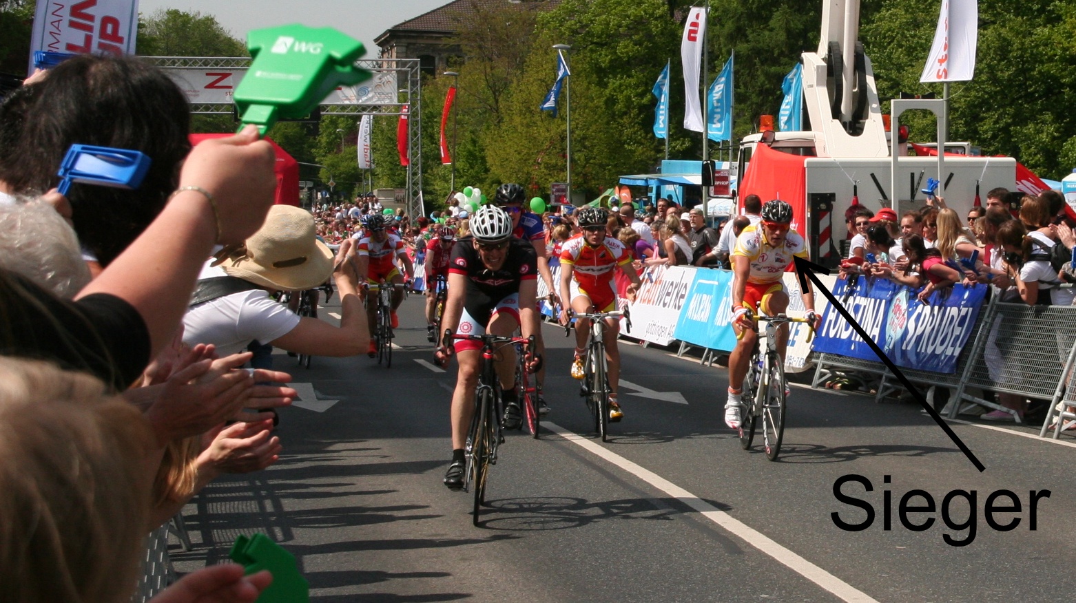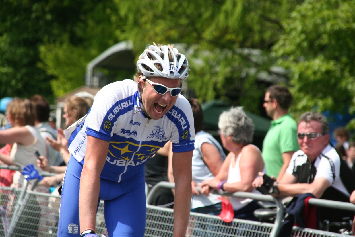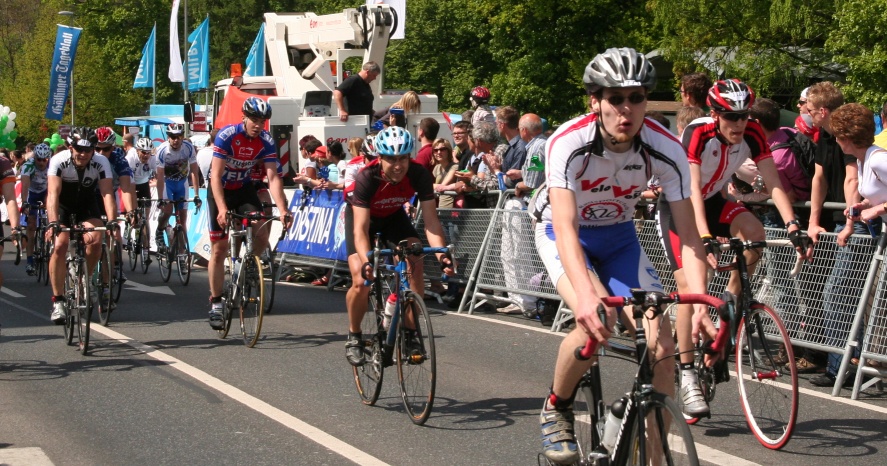 ein team geht, zwei fahrer (blaue trikots), springen nach vorne, ich hinten rein, die lücke ist nach hinten da. der erste geht aus dem wind, nur noch zu zweit. treten, treten, er aus dem wind, ich in den wind, noch 400m, ich lasse ihn wieder vorbei, kurzer blick unter den arm, die sind 20-30m (gefühlt) weg, ich halte das hinter rad, jetzt nicht vor in den wind, ich warte zu lange, von hinten kommen 3 fahrer vorbei, was für ein geschwidigkeitsüberschuss, und ich habe schon angetreten, zu viert nebeneinander die letzten 50m, hinter mir der rest der gruppe, 10-20fahrer, ich weiß es nicht, beißen, geschafft, den vierten platz in der gruppe konnte ich halten was platz 16 insgesamtt ausmacht!