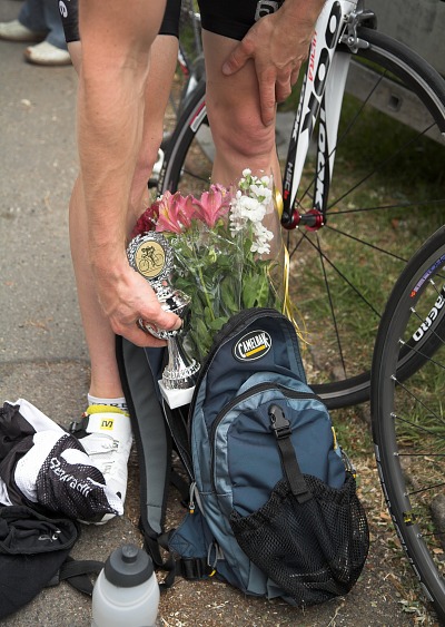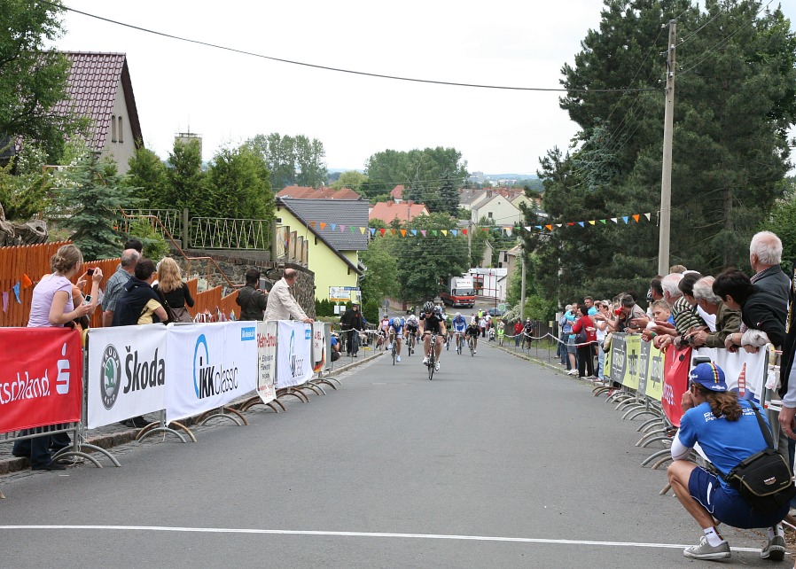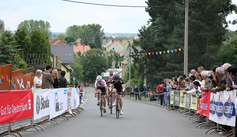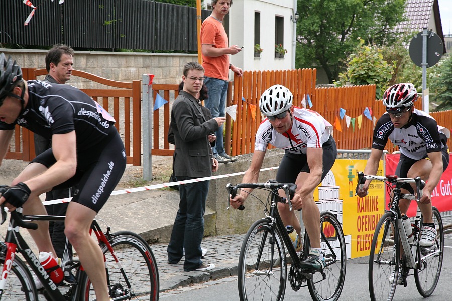 Hinab nach Bahren wieder gleiches Spiel von meiner Seite mit Einfahrt in die Kohlenstrasse von der Spitze. Diesmal kam es zwar nicht zu ruckartigen Attacken, aber dennoch setzte sich vorn ein Pärchen ab, Charlie liess schnaufend eine Lücke reissen und ich dachte, er sei am Ende und setze mich oben vor ihn. Hier ruft mir Charlie allerdings zu, dass Heiko im Führungsduo dabei ist, also wurde die Sache nun deutlich kontrollierter. Etwas Übersicht verschaffend wurde mir erst jetzt klar: wir hatten es also geschafft, mit gleich vier Fahrern im 12er-Spitzenfeld zu liegen, das ergab nun alle Optionen, die wir uns gewünscht hatten! Was nun folgte, war ein konsequentes Ausnutzen unserer starken Position: nach der Schloßstrassenabfahrt griff Charlie an und ich konnte hinter ihm die Lücke öffnen lassen. Kurz vor Grimma wurde klar, dass Heiko aus dem Führungsduo zurückgefallen war und auch Charlie kam weder ganz an ihn ran, noch von uns weg. Also entschied ich, einen ruckartigen Nachsetzversuch zu wagen, dem glücklicherweise niemand folgen wollte oder konnte. Peso musste sich nun hinten alleine um die Lücke kümmern. Am unteren Teil des Hohnstädter liefen dann Charlie und ich auf Heiko auf, vor uns nur ein Einzelfahrer und hinter uns ein Loch von ca. 150 Metern. So kamen wir im Dreierpack durch die zweite Zieldurchfahrt und hatten nur einen Einzelfahrer vor uns. Könnten wir die Sache in Form eines "Teamzeitfahrens" packen?
