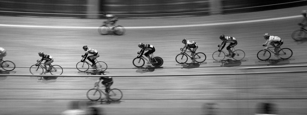 * (blaue) „Steherlinie“: Sie erfüllt verschiedene Zwecke und ist im Prinzip auf 2/3 der Fahrbahnbreite, mindestens aber 2,50 m vom Innenrand der Fahrbahn angebracht. Bei Steherrennen erfüllt sie eine ähnliche Funktion wie die rote Linie im Sprint, d. h. angegriffene Steher müssen unterhalb der blauen Linie bleiben und dürfen, wenn sie unterhalb der blauen Linie fahren, nicht links überholt werden. Bei 2er-Mannschaftsrennen fahren die abgelösten Fahrer (langsamer) oberhalb der blauen Linie, um die im Rennen befindlichen Fahrer nicht zu behindern.