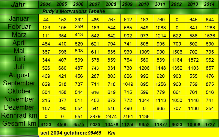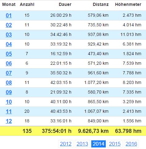 Bei mir waren es 2014 letztlich knapp 6000 km und so um die 80.000 hm.