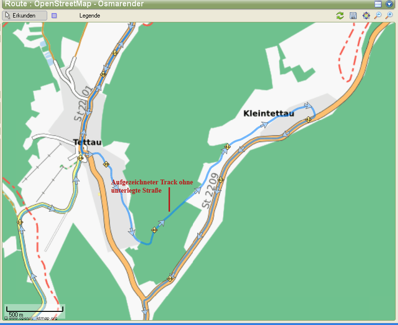 Man wählt A (Knoten setzen) und malt so den Verlauf des Tracks nach, achtet dabei darauf, den Anschluß zu den bestehenden Straßen herzustellen.