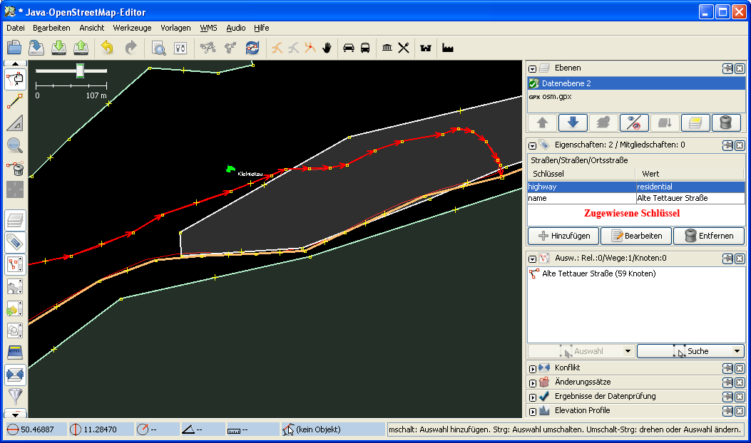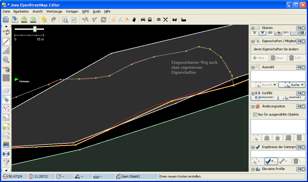 Der eingezeichnete Weg muß nun noch mit Attributen versehen werden, die Aufschluß über den baulichen Zustand, eventuelle Fahrradwege etc. geben. Eine Übersicht der verschiedenen Elemente mit Bildbeispielen gibt es hier.