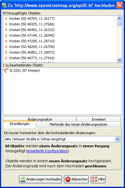 Die vorgenommenden Änderungen am Datenbestand müssen nun auf den Server von OSM geladen werden. Man wählt Datei --> Daten hochladen, vergibt einen kurzen Kommentar, der die Änderung beschreibt, und klickt auf "Änderungen hochladen".